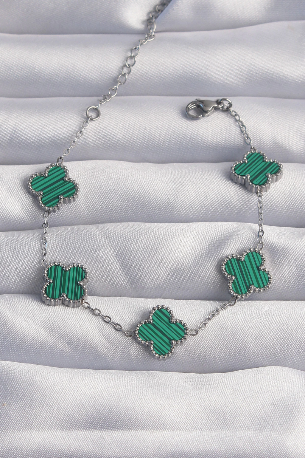 BFS 316L Çelik Gümüş Renk Çizgili Yeşil Mineli Yonca Bileklik