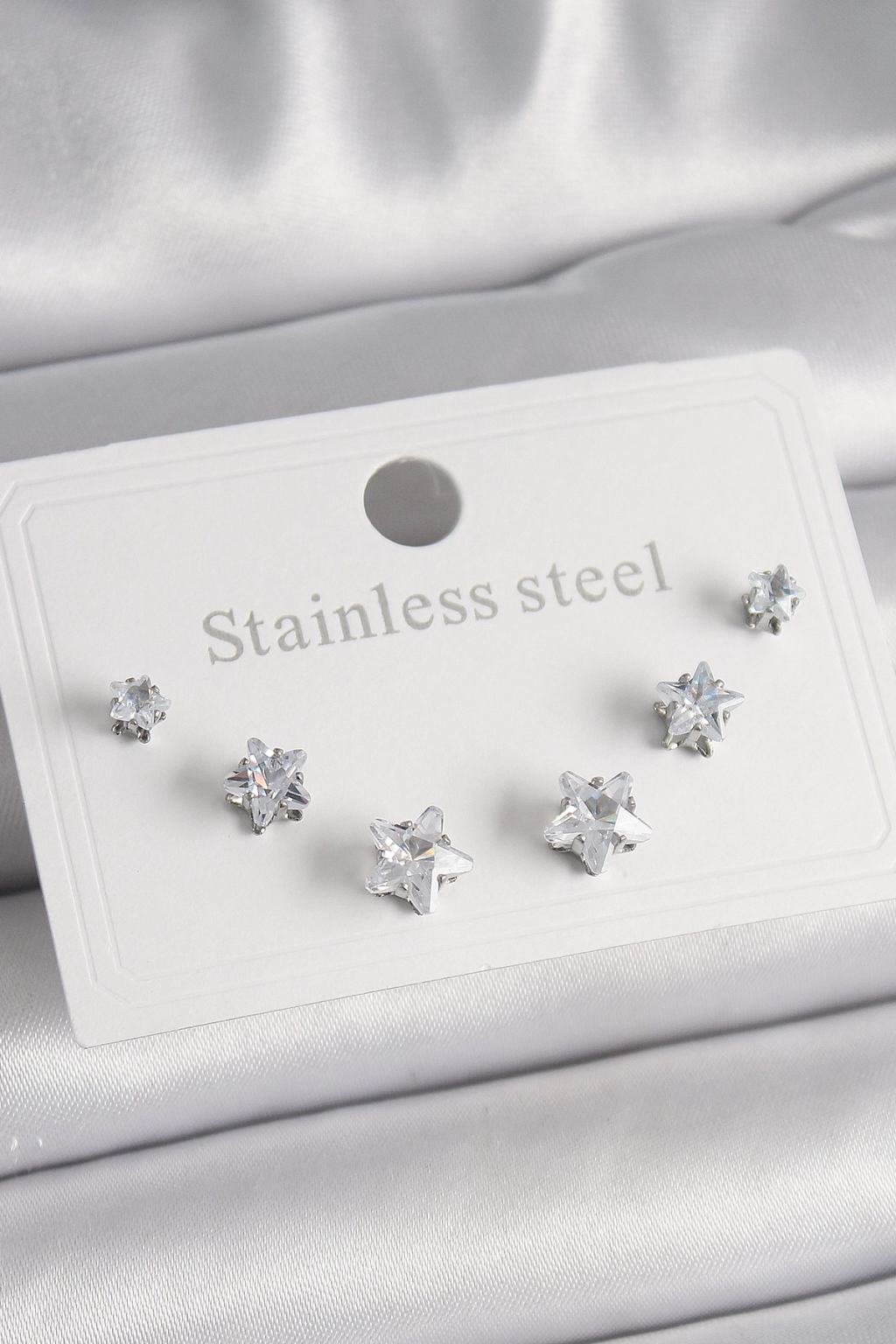 BFS 316L Çelik Gümüş Renk Zirkon Taşlı Yıldız Model Kadın Küpe Seti