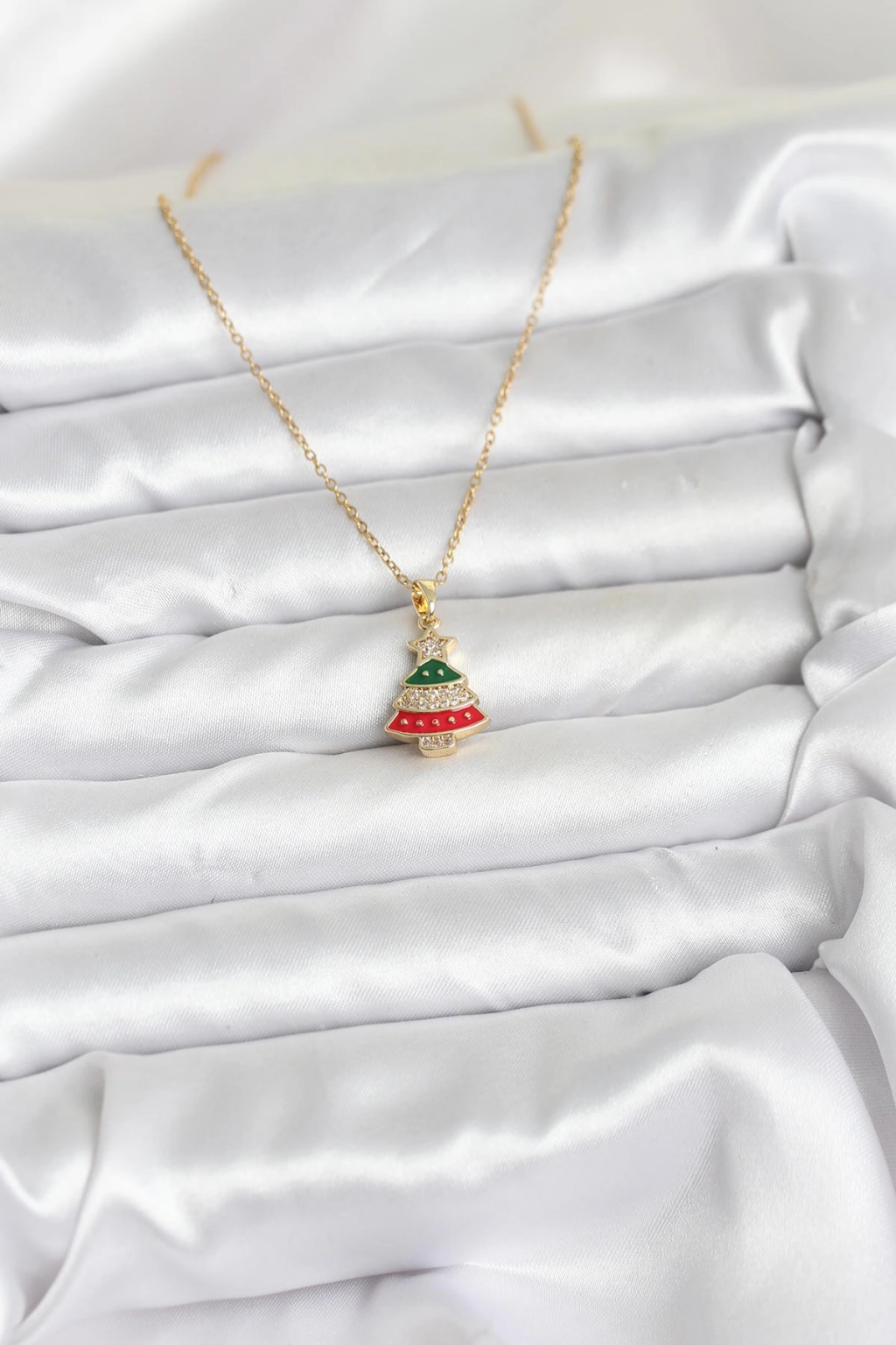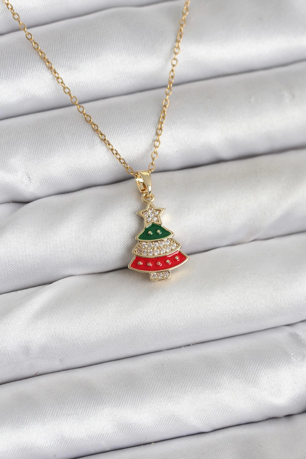 BFS 316L Çelik Zincir Gold Ren Çam Ağacı Model Zirkon Taşlı Yılbaşı Temalı Kadın Kolye