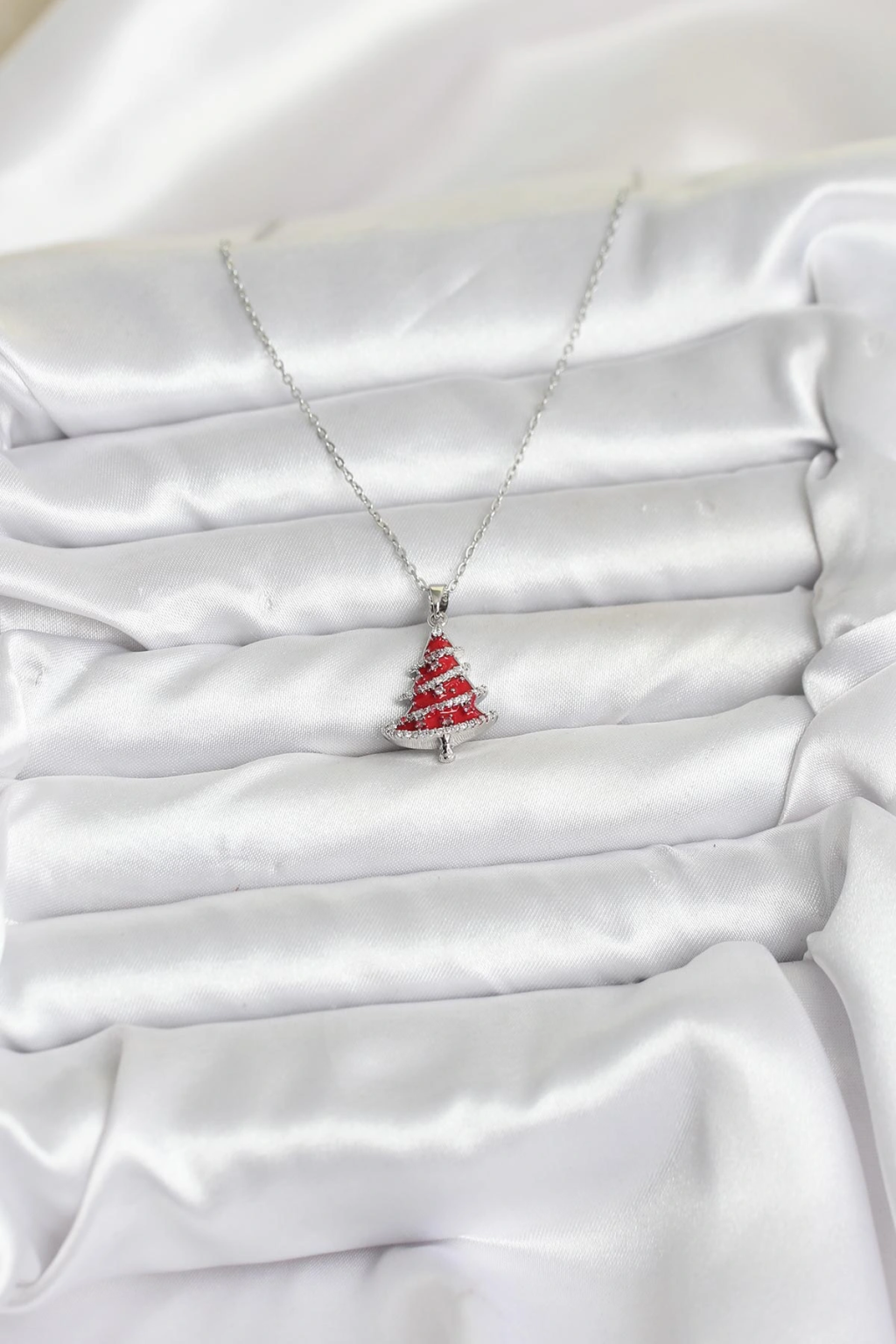 BFS 316L Çelik Zincir Gümüş Renk Kırmızı Çam Ağacı Model Yılbaşı Temalı Kadın Kolye