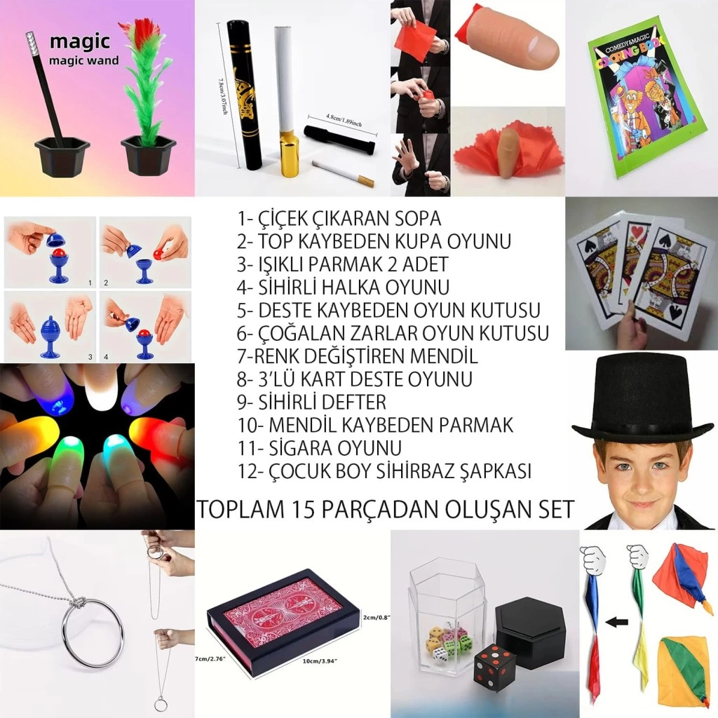 Setin içinde ışıklı parmaklar, renk değiştiren mendil, çiçek çıkaran sopa, sihirli kartlar, şapka ve daha birçok eğlenceli numara bulunmaktadır. Çocuklar hem arkadaşlarına hem de ailelerine gösteriler yaparak yaratıcılıklarını ve özgüvenlerini artırabilir.