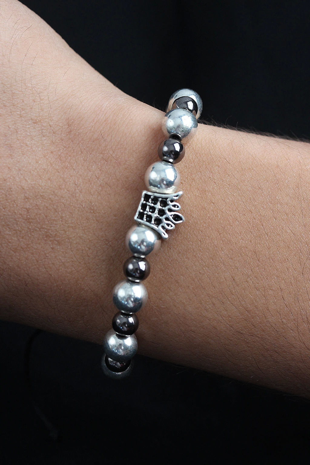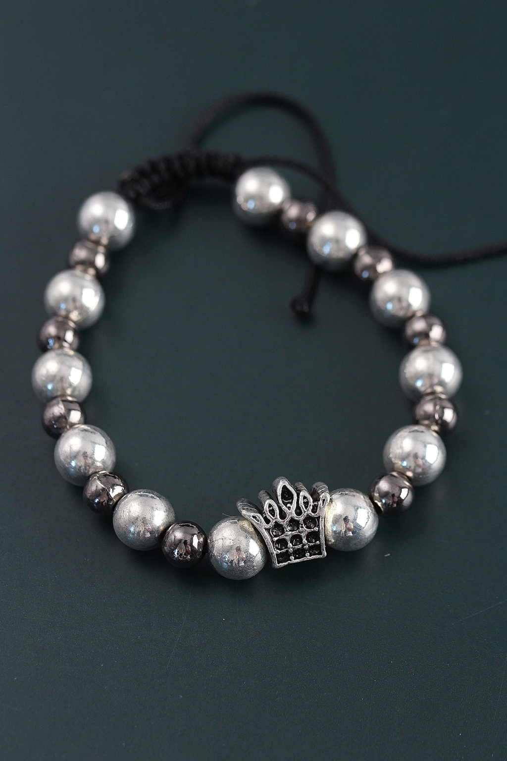 BFS Doğal Taş Kral Tacı Model Gümüş Ve Füme Renk Asansörlü Erkek Bileklik