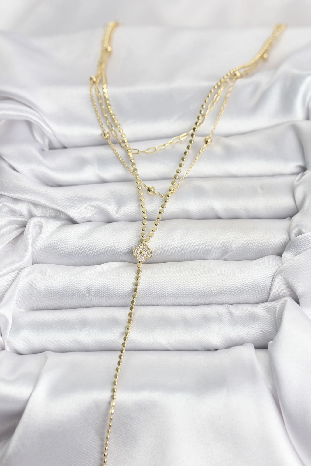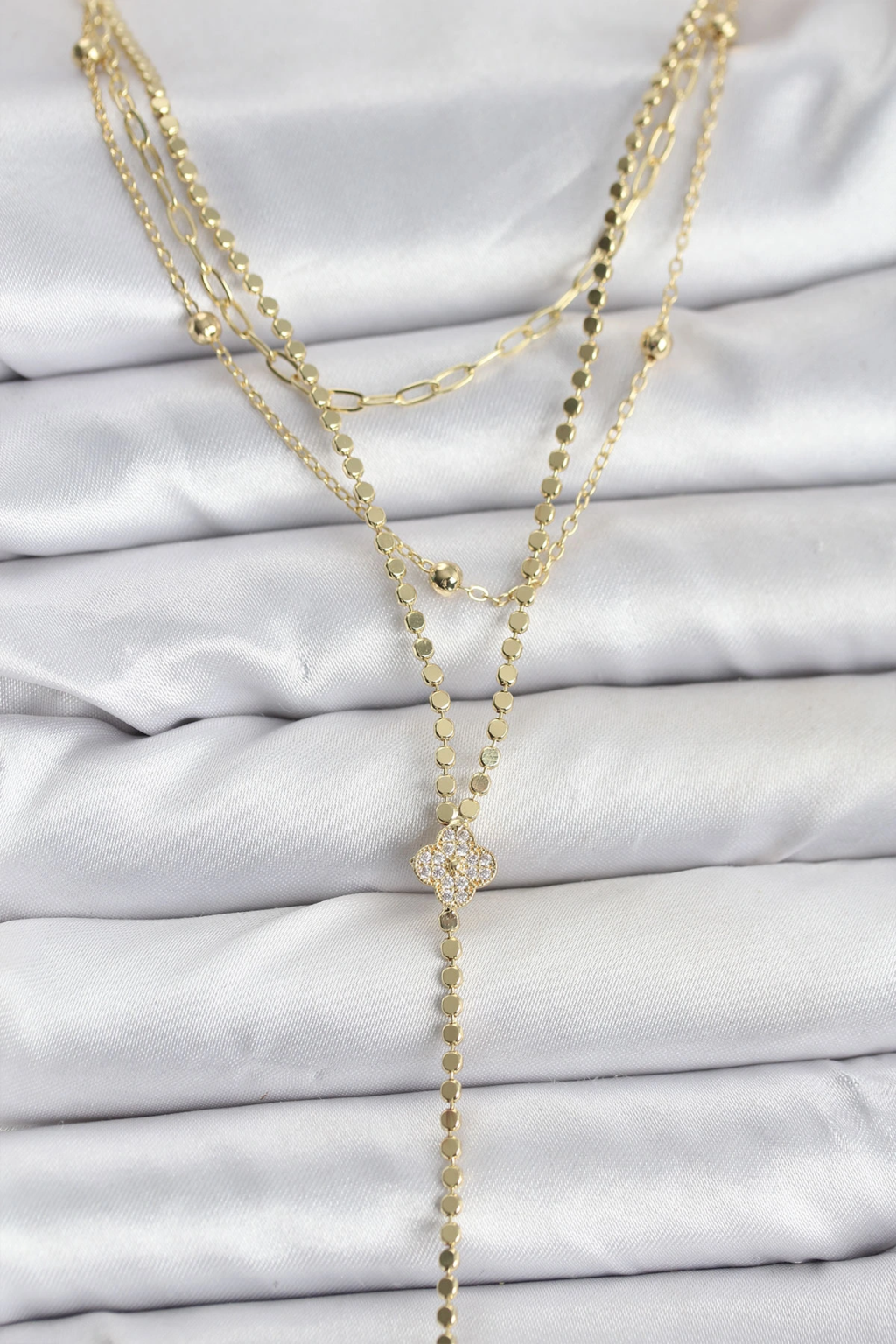 BFS Pirinç Gold Renk Zirkon Taşlı Yonca Model Detaylı 3'lü Kombin Y Kadın Kolye