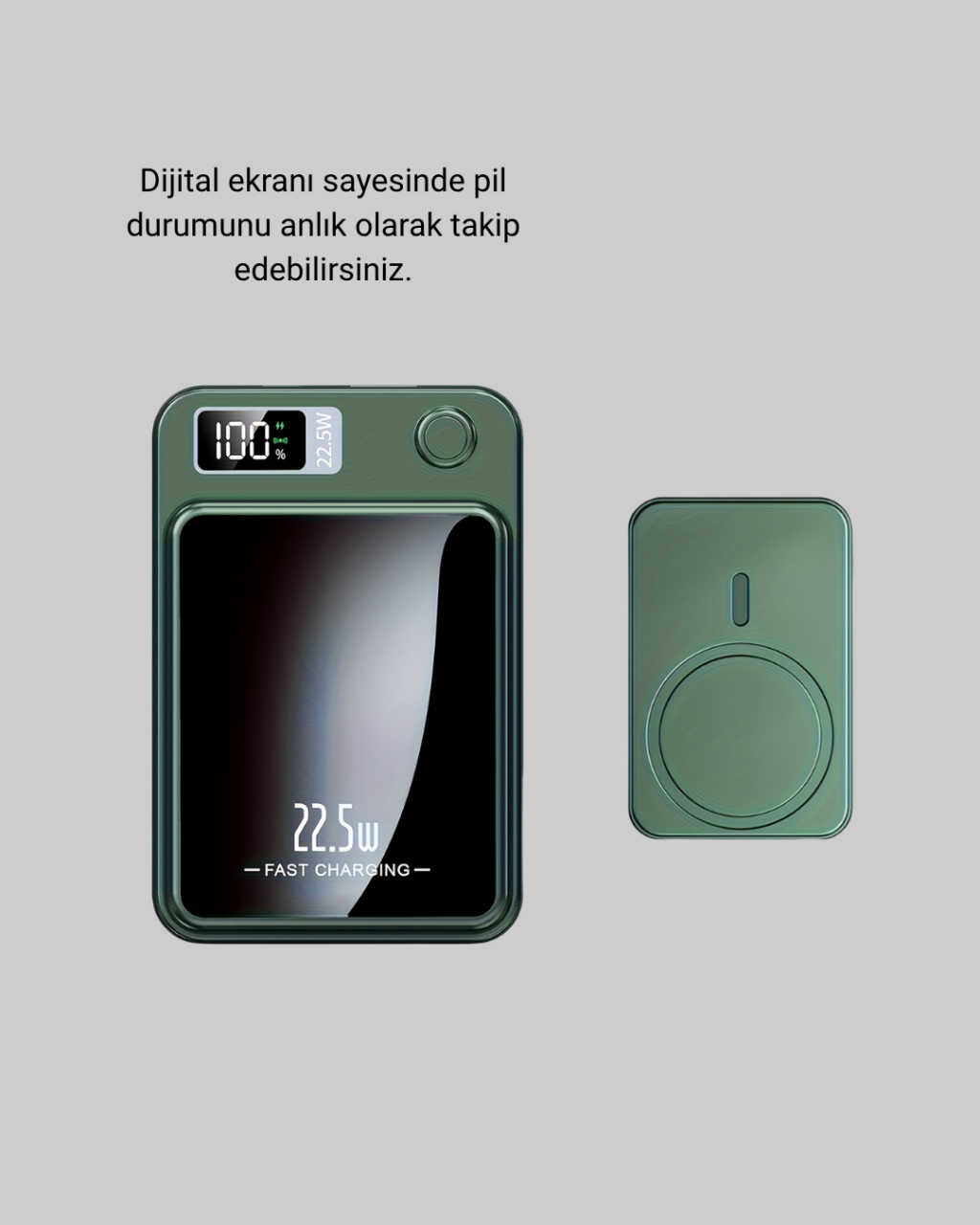 Şıklık, güç ve taşınabilirlik bir arada! MagSafe Powerbank 22.5W Hızlı Şarjlı ve Kompakt Kablosuz Şarj Cihazı, kablosuz teknolojiyi güçlü performansla buluşturur.10.000 mAh bataryasıyla telefonunuzu, tabletinizi veya kulaklığınızı defalarca şarj edebilirsiniz.MagSafe uyumlu manyetik sistemi, cihazınızın arkasına mükemmel şekilde yapışarak güvenli bir şarj deneyimi sunar. Hareket halindeyken bile bağlantı sabit kalır.22.5W hızlı şarj desteği, enerjinizi hızla geri kazandırır; kablosuz şarj özelliği ise tam özgürlük sağlar.Powerbank’in üzerinde bulunan dijital gösterge ekranı, şarj durumunu anlık olarak takip etmenizi sağlar. Kompakt tasarımıyla cebinizde veya çantanızda rahatça taşınabilir.Dayanıklı gövdesi uzun ömürlü kullanım sunarken, zarif tasarımı modern bir görünüm kazandırır.İster seyahatte ister işte olun, MagSafe Powerbank 22.5W Hızlı Şarjlı ve Kompakt Kablosuz Şarj Cihazı ile kesintisiz enerji her zaman yanınızda.Kablolardan kurtulun, teknolojinin özgürlüğünü yaşayın!