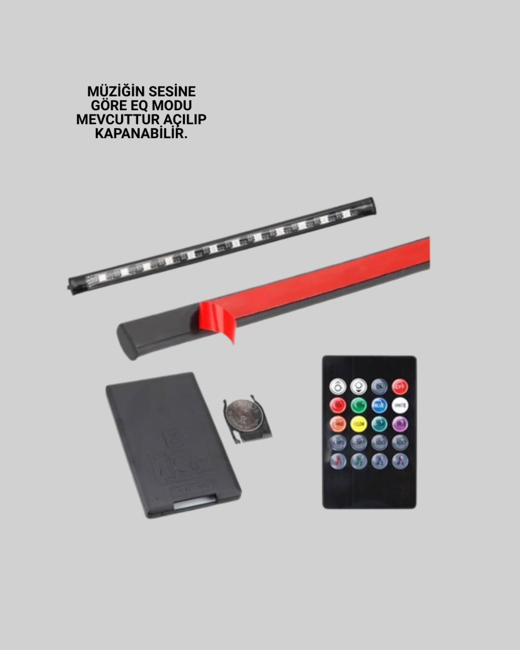 Bu kompakt LED ışık sistemi, araç içerisinde renkli ve dinamik bir ambiyans yaratmak isteyenler için tasarlanmıştır. Her biri 13 cm olan 4 adet ışık ünitesi, toplamda 48 LED boncuğu barındırır. Kurulumu, ürünün üzerinde bulunan çift taraflı bant sayesinde kolayca yapılabilir.Sistem, 12V DC araçlarda kullanılmak üzere tasarlanmıştır. Güç bağlantısı doğrudan çakmaklık soketi ile yapılır. Kumandası ile 12 farklı sabit ışık ve RGB geçişli modlar arasında geçiş sağlanabilir. Ayrıca açma-kapama fonksiyonu kumanda üzerinden kontrol edilir.LED'ler düşük akımla çalışır (20 mA x 12) ve uzun ömürlüdür. Tüm binek araçlar, ticari araçlar ve motosikletlerle uyumlu yapısı sayesinde geniş kullanım alanı sunar.