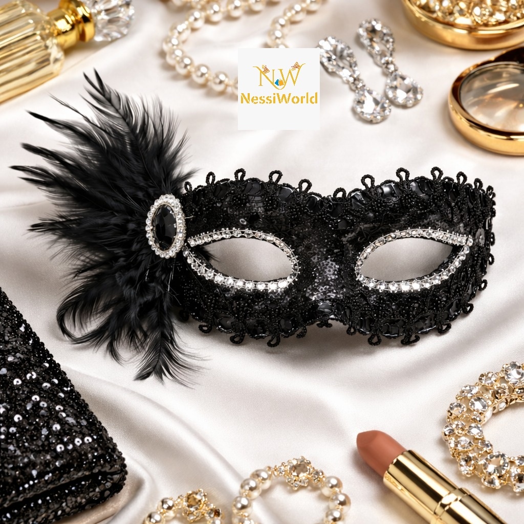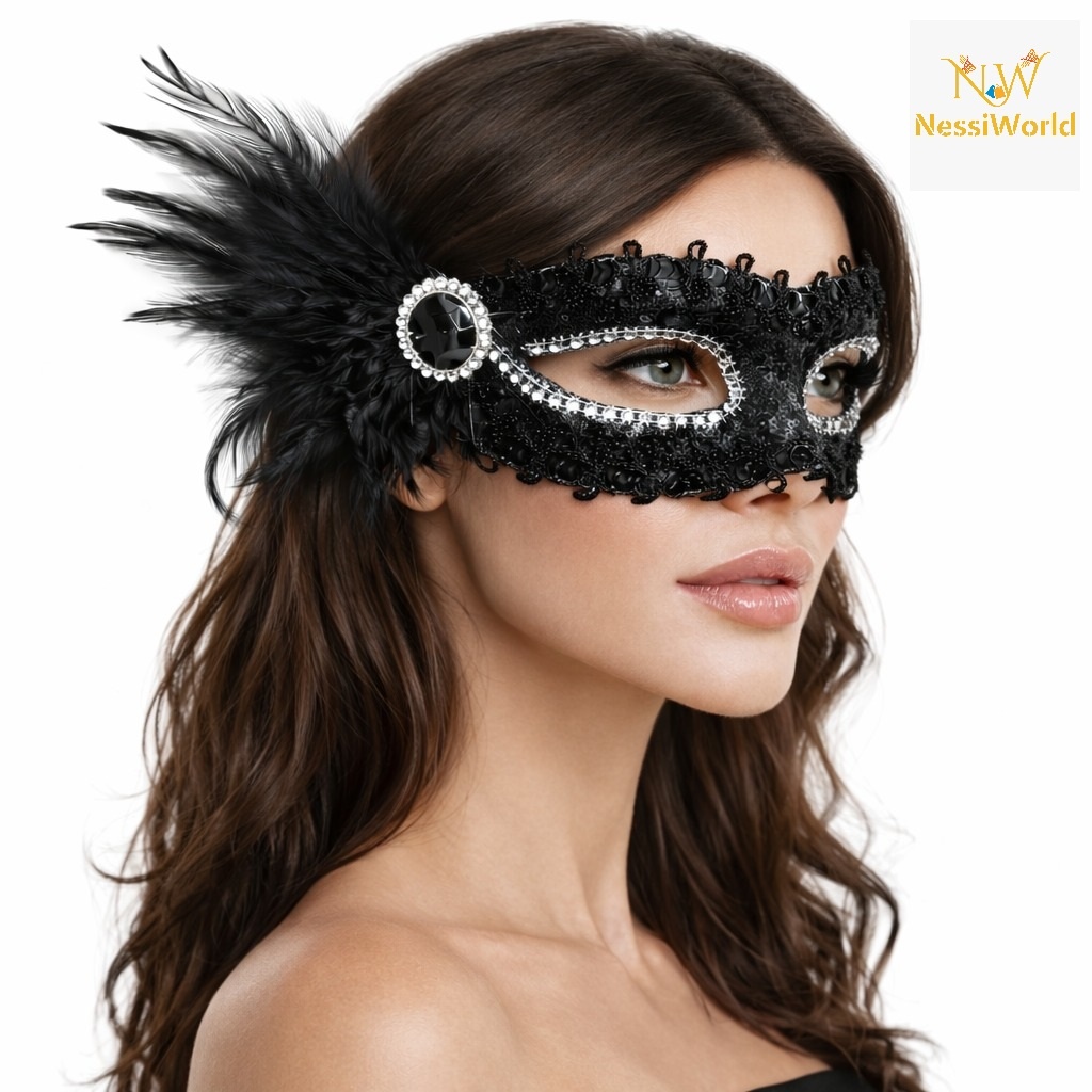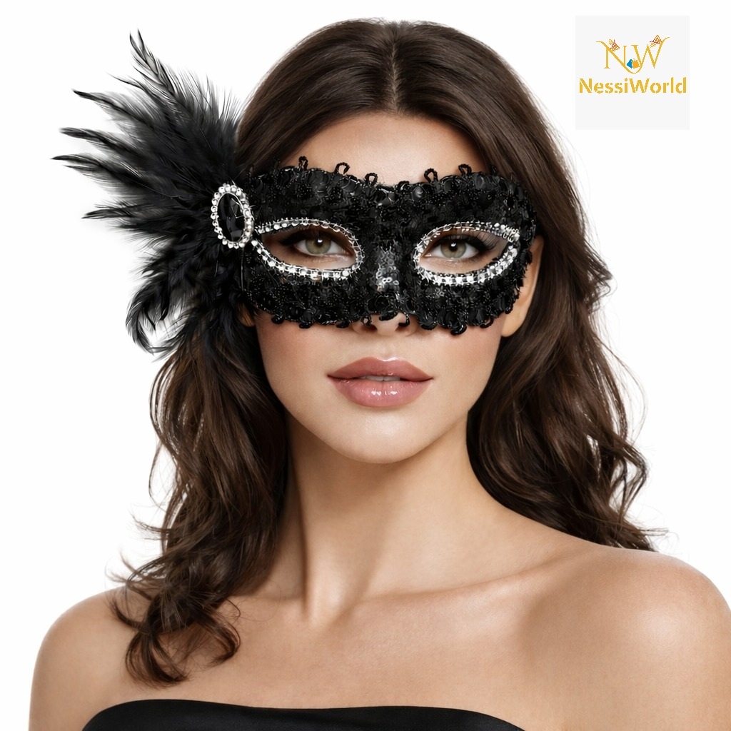 Siyah Taşlı Venedik Parti Maskesi – Tüylü Payetli